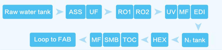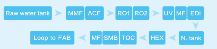 工藝特點:水中大部分的鹽分采用反滲透方式去除,后段采用MB系統(tǒng)制取高純水,可有效的延長MB系統(tǒng)的再生周期,減少酸堿的使用量。